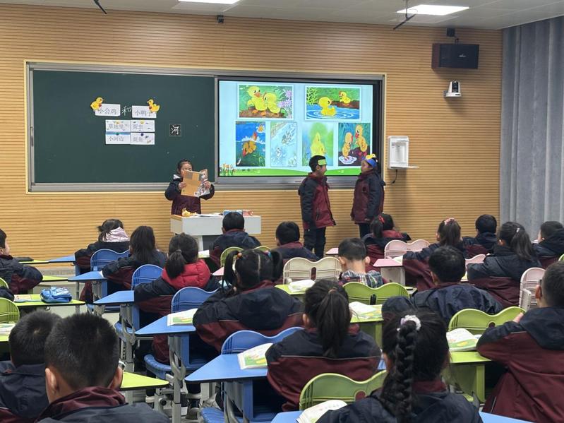 李露露老师与一(6)班的孩子共同演绎一节生动有趣的研讨课——《小公鸡和小鸭子》。课堂开始,李老师从词语复习认读的方式引入课堂。课中,李老师设计了色彩鲜艳、生动可爱的原创插画,考虑了一年级学生的认知特点,牢牢抓住学生们的注意力。李老师又创设了角色扮演的互动环节,充分激发了孩子们参与热情,同时又锻炼了他们的表达能力和团队协作能力。