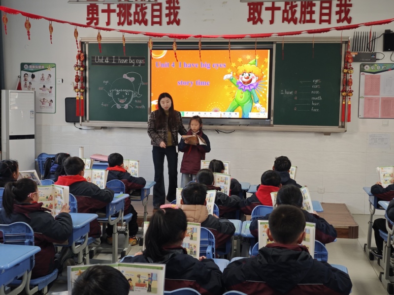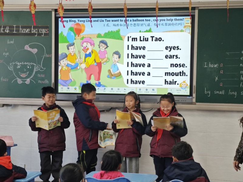 进入文本前,余老师用一首欢快的歌曲创设情境,组织学生边听边唱边动,以激活已知、活跃课堂。教学中,老师立足语篇,通过复习旧知I have...引导学生利用身边的事物进行口语表达以巩固句型,接着通过听、说、读、看来学习五官类词汇并不断练习语言输出。余老师在课堂教学中做到以生为本,课堂教学设计条理清晰、训练扎实。深入语篇时,学生们在分角色朗读、角色竞演、续编对话等活动中增强了英语学习兴趣,发展了语言能力,提升了思维品质。