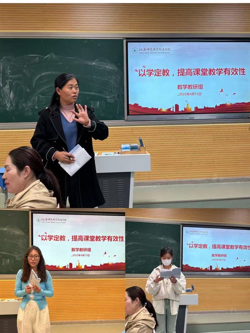 在集体教研活动中,数学教研组长赵凌霜老师带领全体教师围绕 “以学定教,提高课堂教学有效性”展开深度研讨。接着老师们围绕本节课哪些地方体现了以学定教的理念展开了激烈的讨论,。最后赵老师指出在教学中我们要根据学生学情,改变教学案例,灵活调整教学方式,激发学生的思维。