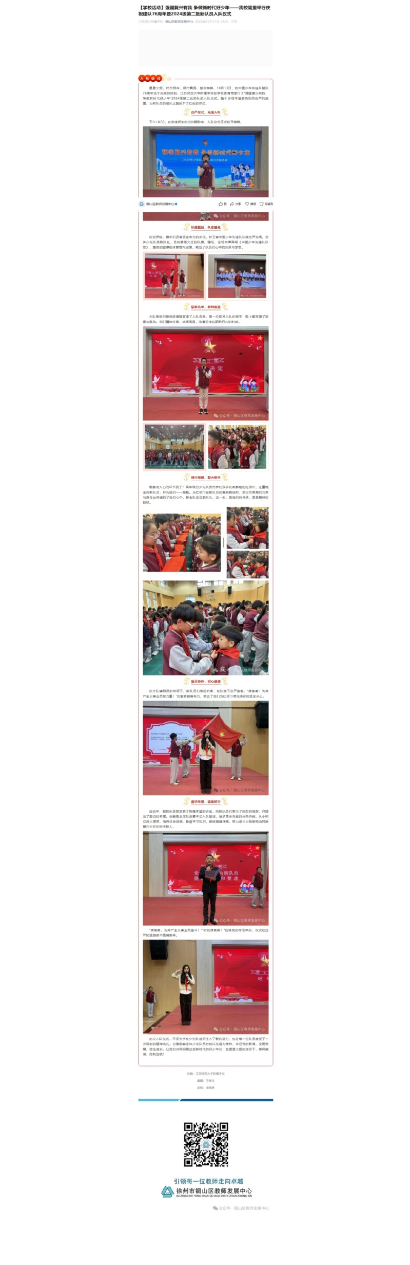 铜山区教师发展中心10月17日报道我校专题活动:强国复兴有我 争做新时代好少年——我校隆重举行庆祝建队76周年暨2024级第二批新队员入队仪式