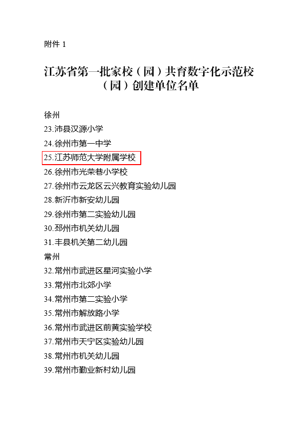 日前,江苏省教育厅办公室公布了江苏省第一批家校(园)共育数字化示范校(园)创建单位名单,徐州仅9所学校入选,我校位列其中。