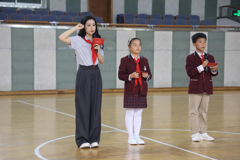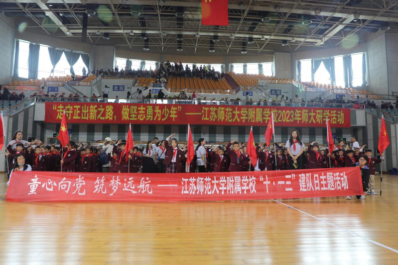 为学习贯彻党的二十大精神,进一步落实《中共中央关于全面加强新时代少先队工作的意见》要求,用实际行动把红色基因一代代传下去,切实做好少先队组织政治启蒙和价值观塑造的主业主责,10月13日上午,江苏师范大学附属学校在江苏师范大学体育馆举行了少先队新队员入队仪式暨“十·一三”少先队建队日主题活动。活动由校大队委成员、四(8)中队孙潇檬、四(2)中队高天昊、大队辅导员宋培瑜老师主持。学校全体师生参加了活动。