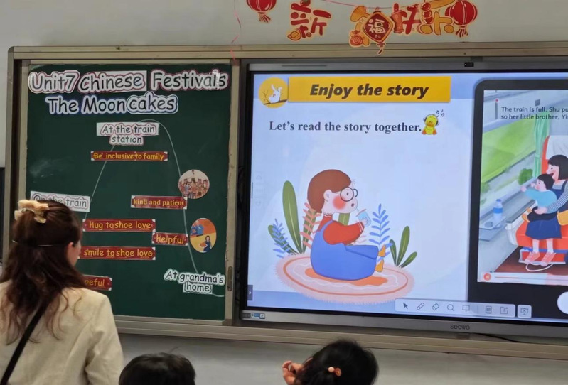 余老师首先通过对课本U7 Story的文本回顾,引出几个节日。当孩子们提到Mid-Autumn Festival的时候,提出我们在中秋节喜欢吃月饼,由此话题引入到本篇绘本The Moon Cakes中秋趣事。对于本节绘本融合课,孩子们的学习劲头十分充足。在教学过程中,余老师用优秀的口语带领着孩子们对绘本进行了深入的学习和解读。用故事山的方式,呈现绘本人物们的情感变化,让孩子们学有所思。通过Listen and think -- Think and answer -- Read and act 层层递进,问题链由浅入深,环环相扣,思维梯度步步提升,培养了学生的分析能力、归纳能力以及辨别能力,提升了学生的综合素养。